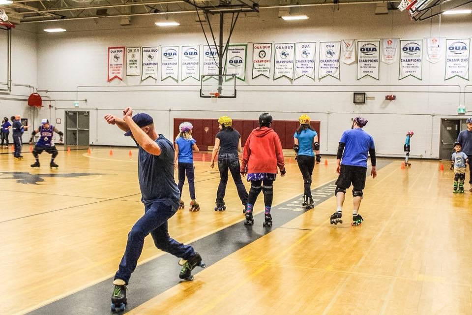 -Weekly social rollerskating : Simply want to smile and roll? Join our Ottawa Quad Sessions. We meet year-round on Friday nights (mostly) for two hours of skating (9-11 pm) at varying locations. We quad to tunes. Typically we are at Carleton University in Norm Fenn gym. It is a huge space with wood floors and we set aside one part of the gym as a learning area if you want to work on something outside of the flow of the rest of the skaters.